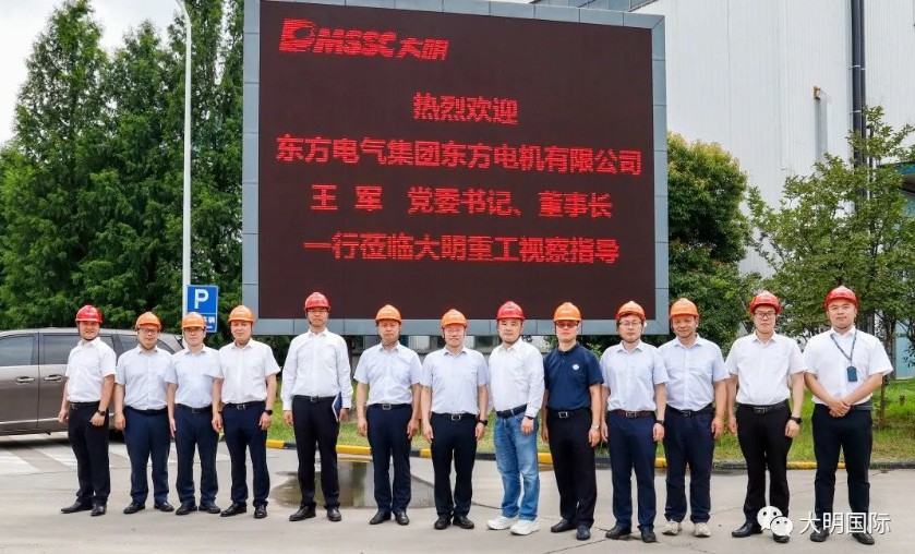 6月26日,东方电气集团东方电机有限公司党委书记、董事长王军,党委常委、总会计师赵强,项目管理中心主任侯伟,数智部部长周亮,采购中心主任潘辉、副主任胡雷一行来访大明集团,进行协同制造基地揭牌及新项目签约。