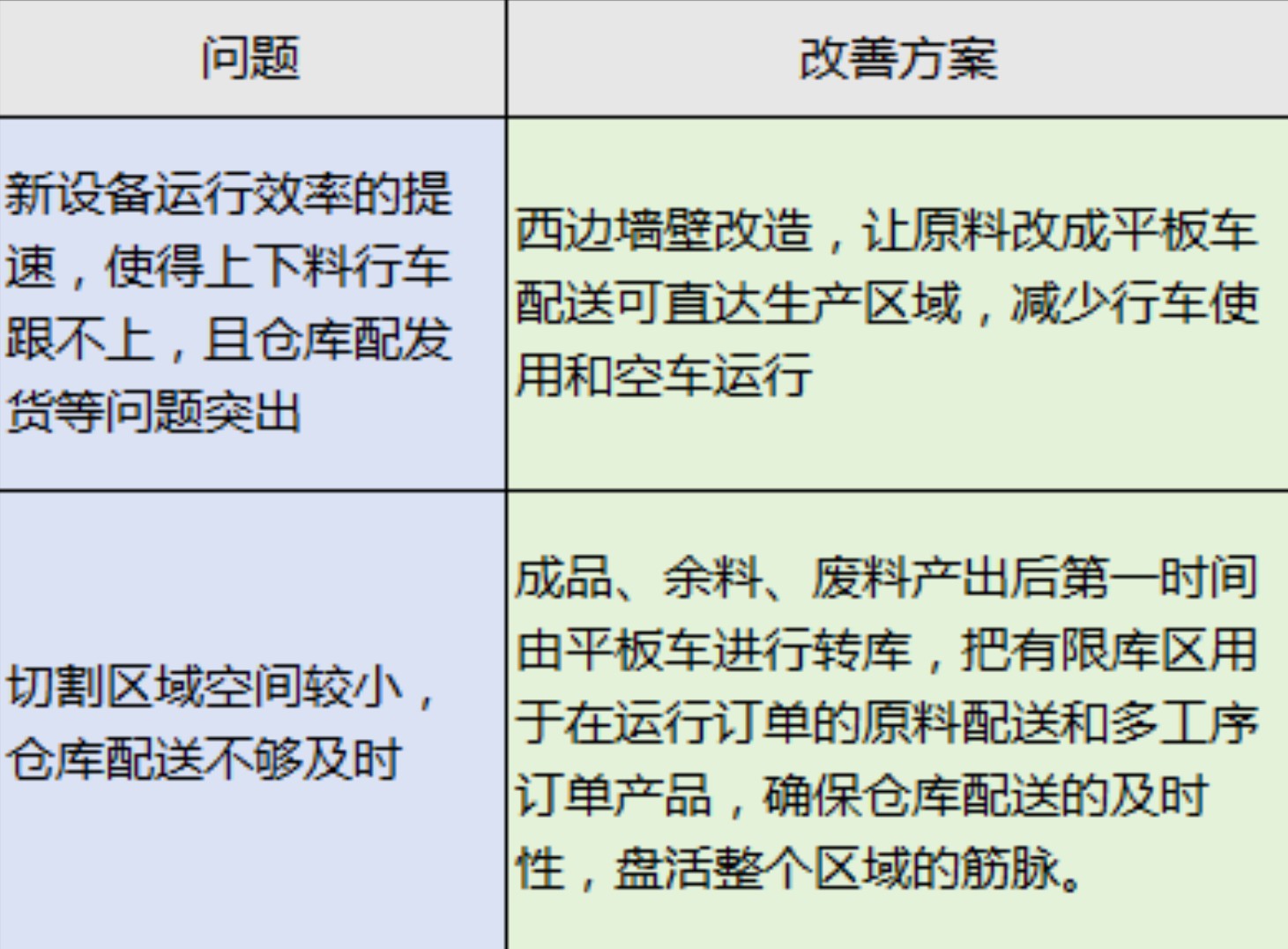 一起来看杭州加工中心深加工车间“龙头”工艺—切割,是如何在3.8亩的狭小地盘(仅占厂区总面积的4%)上“玩转”7台主力设备的。 引进的新设备使得加工速度明显提高,但作业区域不断压缩,集中性下单已成常态化,导致生产车间作业节奏瞬间拉满。 深加工车间的切割、刨边、折弯设备在同一库区顺时摆放,对于多工序加工订单具有天然的效率优势,目前多工序订单占总订单量的60%以上。但同时劣势也较明显,即设备密集度太高,作业空间狭小,相互干涉情况突出。 如何将切割工艺区域“盘活”,保障生产效率和产品质量呢?近期区域优化示例: 比如,针对大族切割机受切割气压作用和齿间隙较大使板材抖动、板底反渣粘连等影响,而出现的切割断面质量欠佳情况。深加工车间重点对大族平台插条进行技术改造,将设备原有铸铁插条改成6mm碳钢插条,齿间隙控制在70mm,通过增加插条密度、齿尖变薄,改善板材抖动和板底反渣现象,进而保障断面质量、优化作业效率。