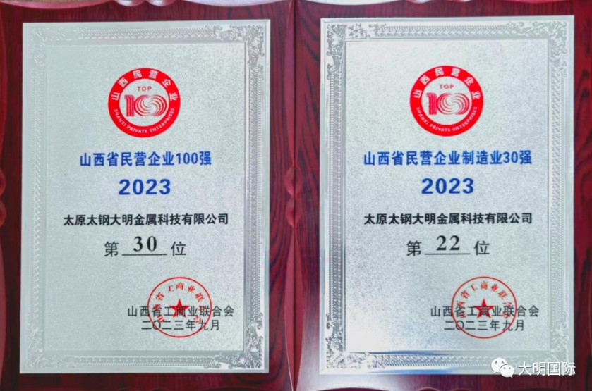 此次入围“2023山西省民营企业100强”和“2023山西省民营企业制造业30强”,不仅是对大明太原加工中心过去一年所取得成绩和服务实力、品牌影响力的充分认可,更是对公司履行市场主体责任的进一步鞭策。