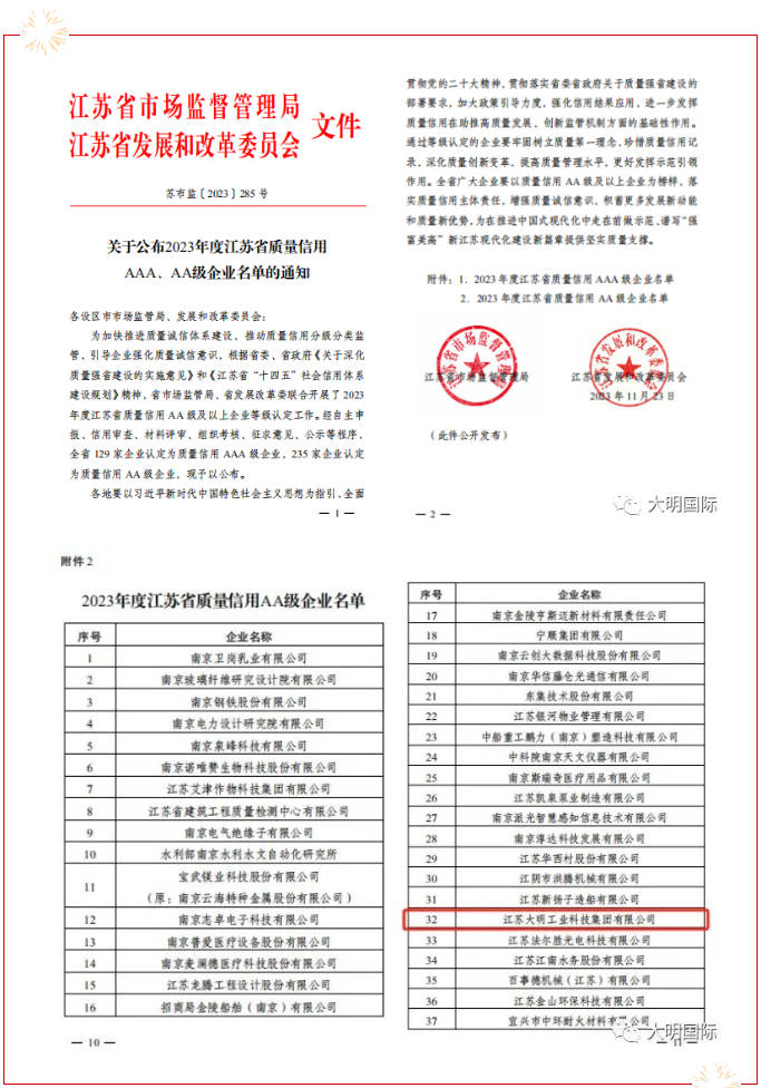 随着社会经济的发展进步及经济全球化的深入发展,诚信已成了当下社会最稀缺的资源之一。此次AA级认定,不仅是对江苏大明质量信用认同的直接体现,对于公司后续市场业务开拓、优化交易成本等也提供了强有力的支撑。