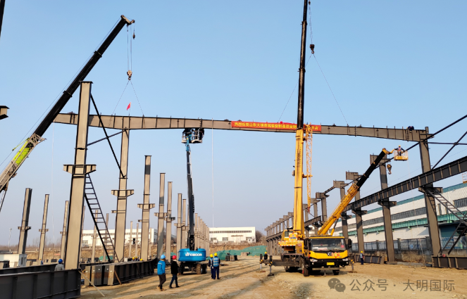 “上梁欣逢黄道日,立柱巧遇紫微星”。首根横梁迎着朝阳徐徐上升、顺利就位,与钢结构立柱平稳衔接,主梁顺利完成安装,标志着项目钢结构安装步入关键阶段。