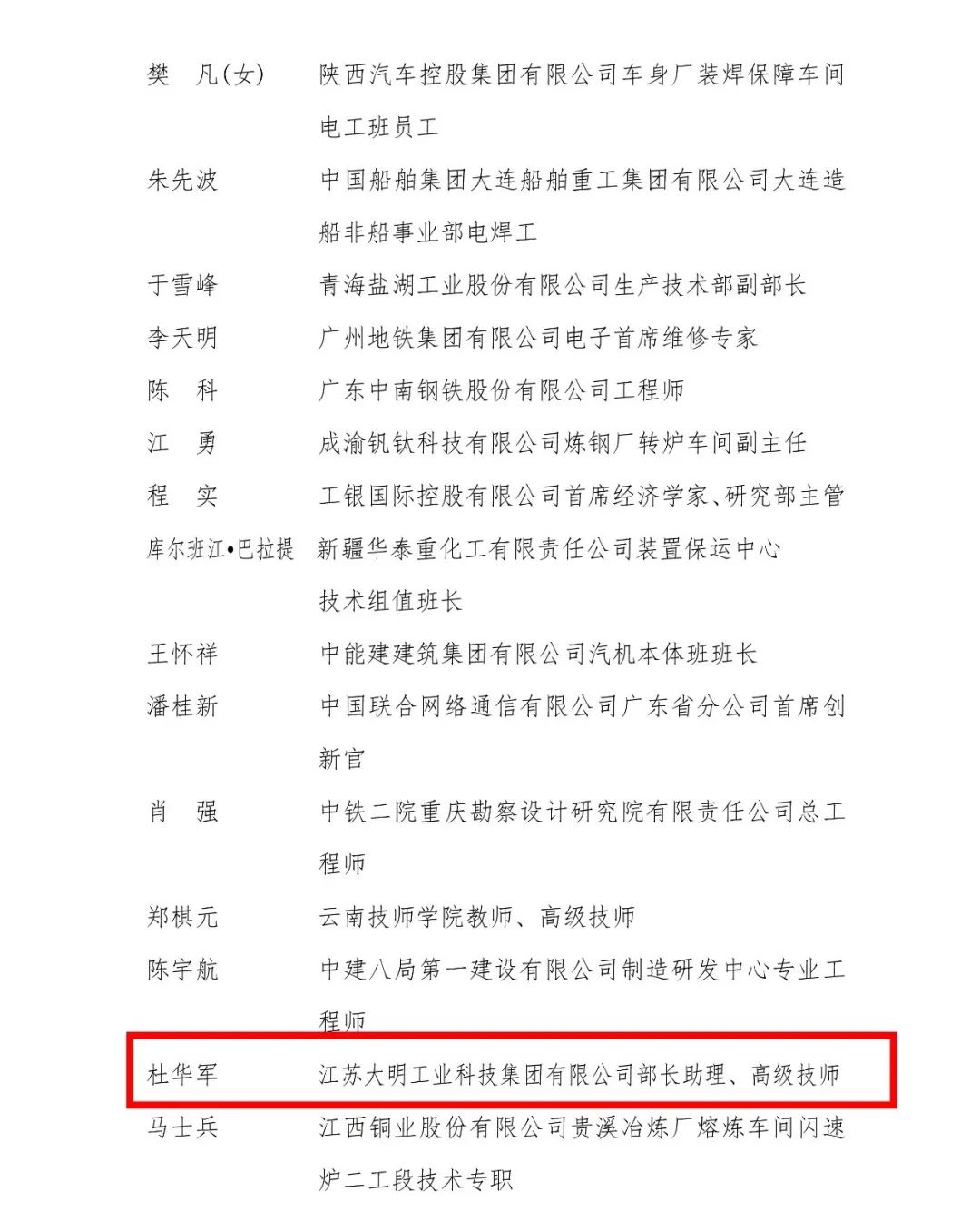杜华军,现任江苏大明部长助理、高级技师,曾荣获全国、江苏省、无锡市“五一劳动奖章”以及“江苏省首席技师”、“江苏文明职工”、“江苏最美职工”、“无锡工匠”等荣誉,2023年获评“无锡大工匠”、2024年荣升 “江苏工匠”。