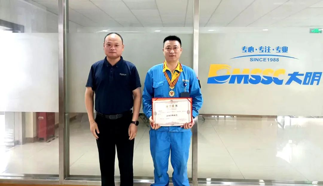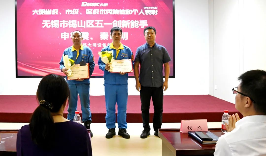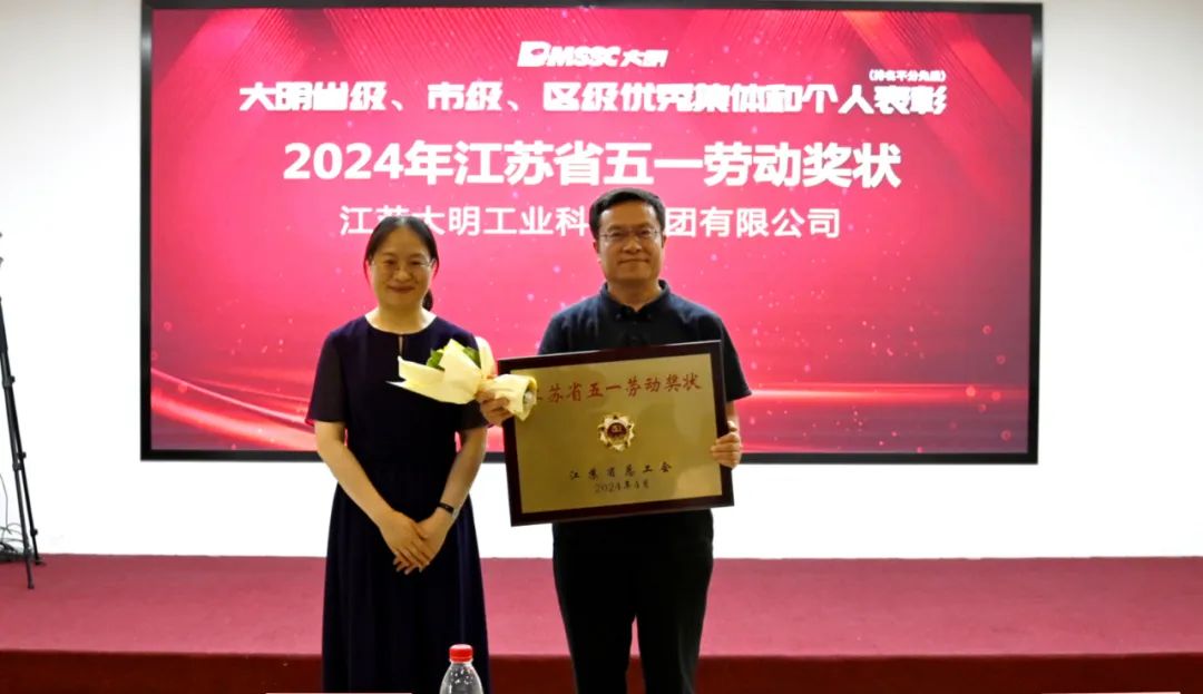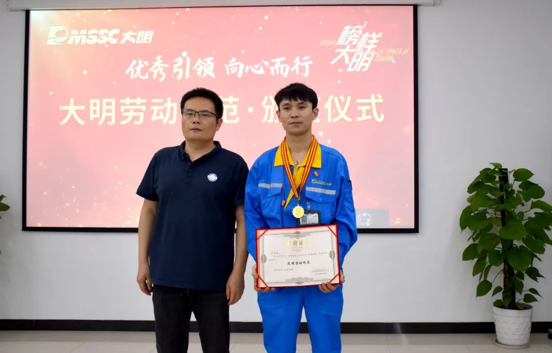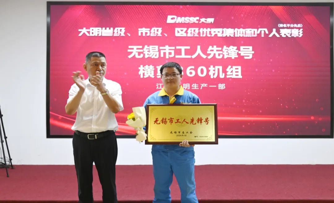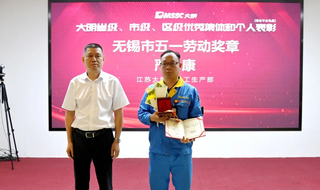▽大明国际常务副总裁钱立与2023年度无锡市五一劳动奖章获得者胡培银为大明劳动模范颁奖