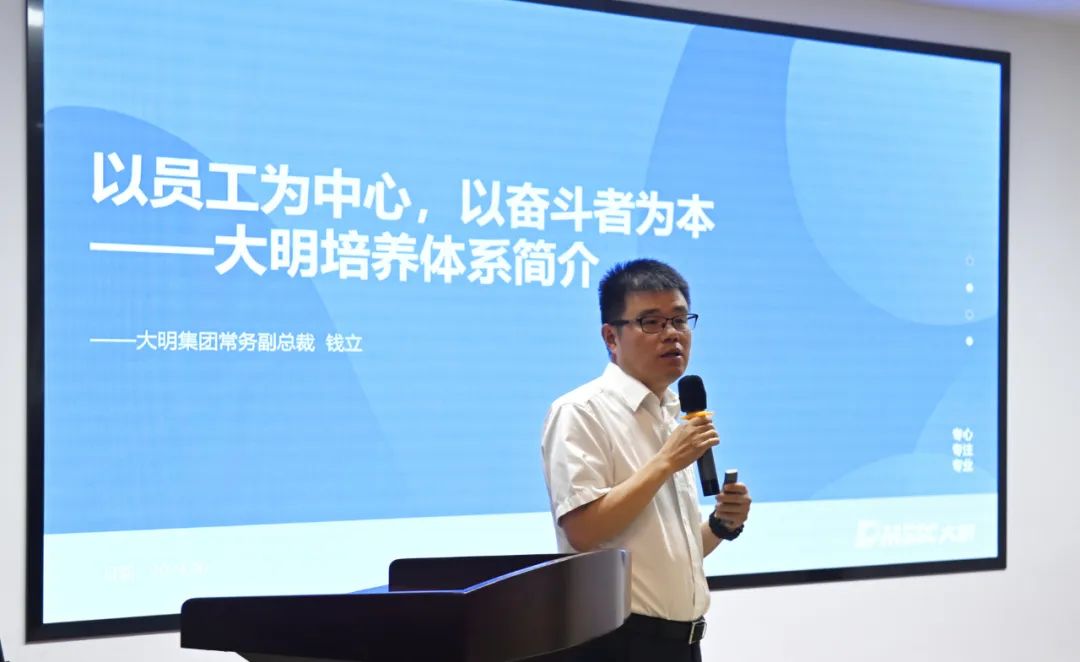 表彰仪式前,钱立常务副总裁分享了《以员工为中心,以奋斗者为本—大明培养体系简介》主题报告。他详细阐述了大明“以员工为中心”的“七巧板”人力资源管理路径和人才培养工作实践情况,并强调企业的竞争本质是人才的竞争,大明重视和珍惜人才,坚持以奋斗者为本,打造职业化、专业化人才队伍,今后将持续优化人才培养体系,多举措激励各条线员工再创佳绩。