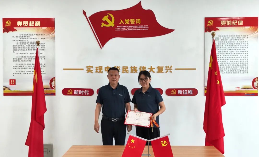 ▽东北塘街道总工会副主席杨凯为秦晓明、申桂震颁发“锡山区创新能手”荣誉