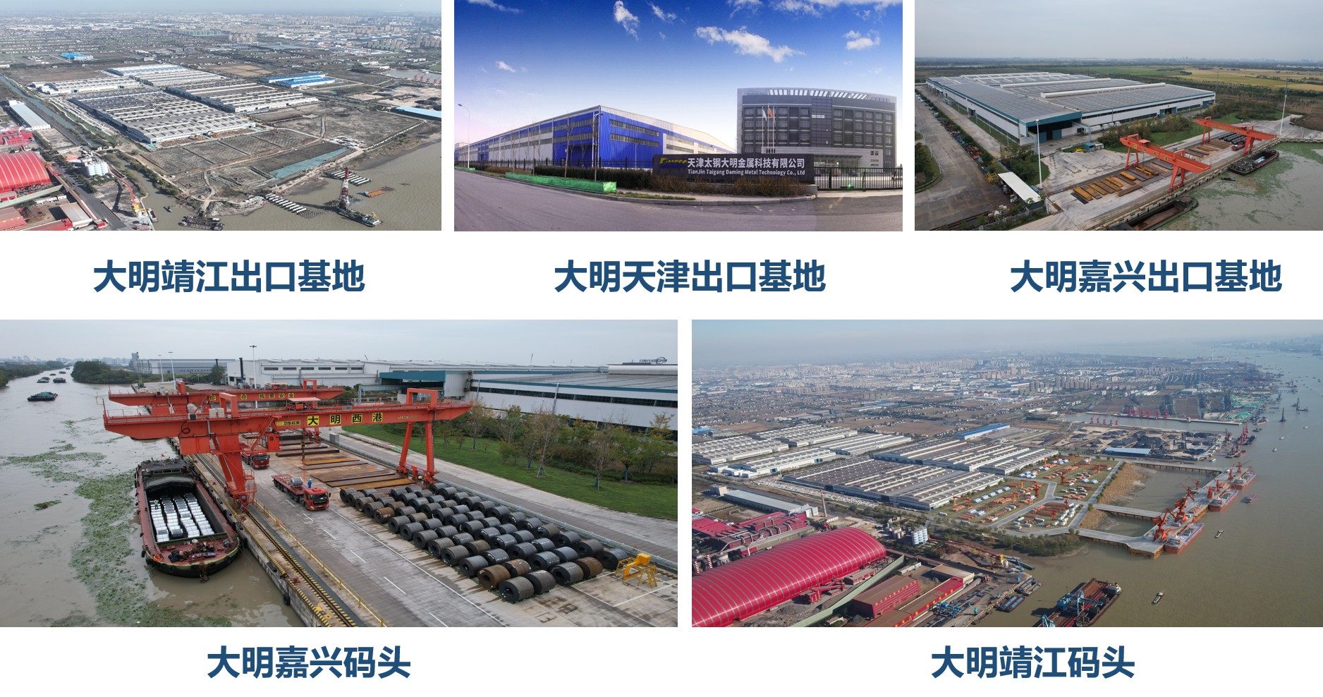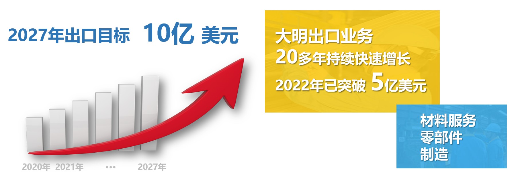 大明拥有三大出口服务基地布局(嘉兴、靖江、天津)、两大码头(嘉兴、靖江),海外业务持续20多年快速增长,2022年海外业务收入突破5亿美元,2027年前目标年收入10亿美元。