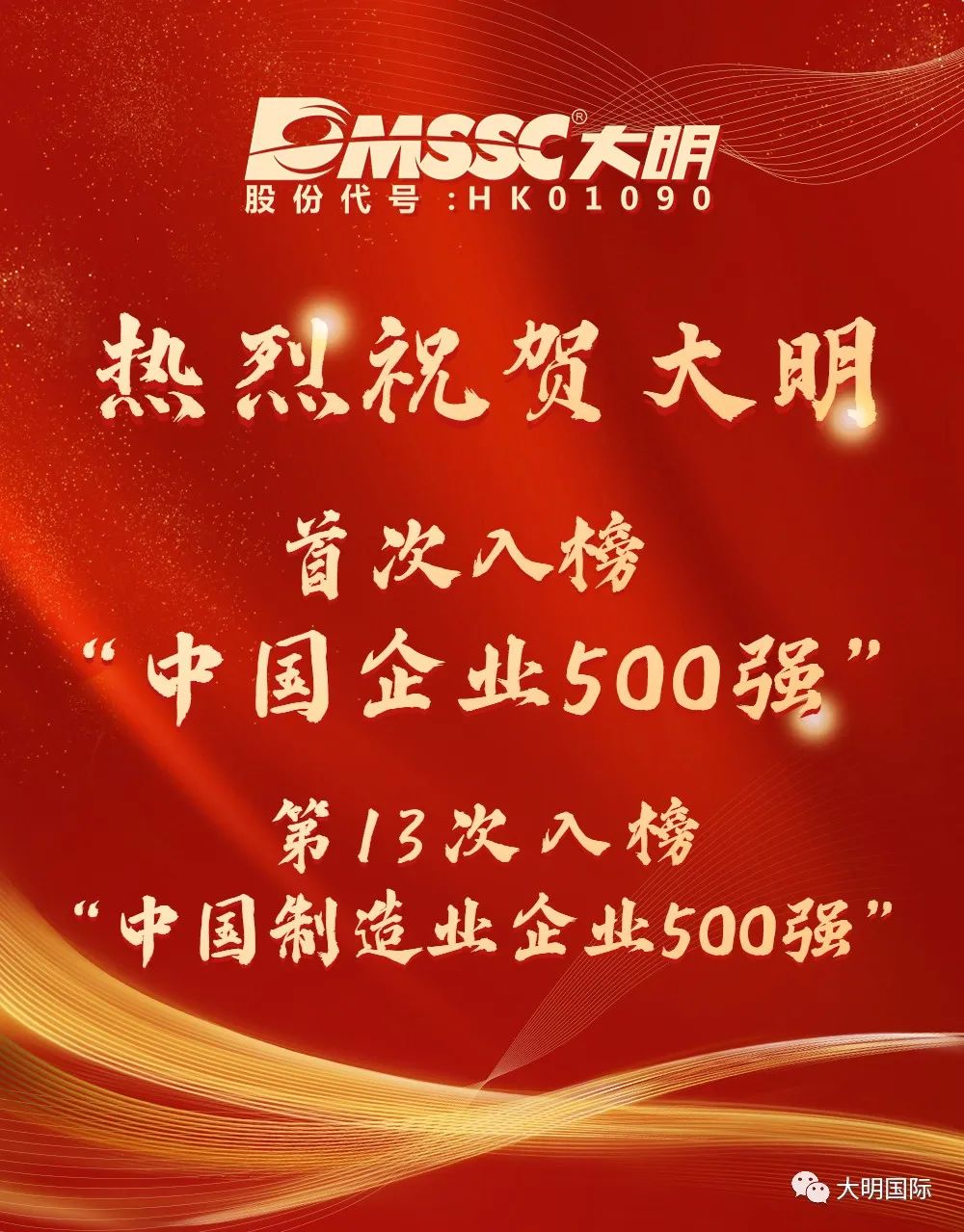 2022年9月,中国企业联合会、中国企业家协会在北京发布了“2022中国企业500强、中国制造业企业500强、中国服务业企业500强”榜单。大明首次入榜“中国企业500强”,位列第472位,同时第13次入榜“中国制造业企业500强”,标志着企业影响力的再次提升。