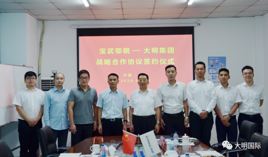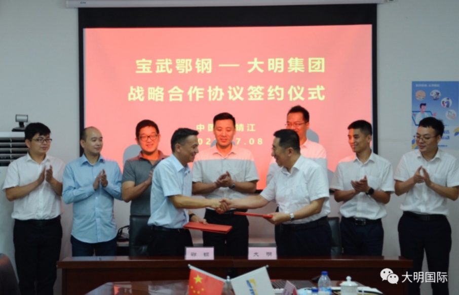2020年7月8日,大明与宝武集团鄂城钢铁有限公司在大明靖江基地签署战略合作协议,宝武鄂钢副总裁艾兵、销售部总经理助理陈煜等领导,大明国际总裁蒋长虹、靖江加工中心总经理陈宁、集团碳钢事业部总经理邓梁峰等参加了签约仪式并陪同参观、座谈交流。