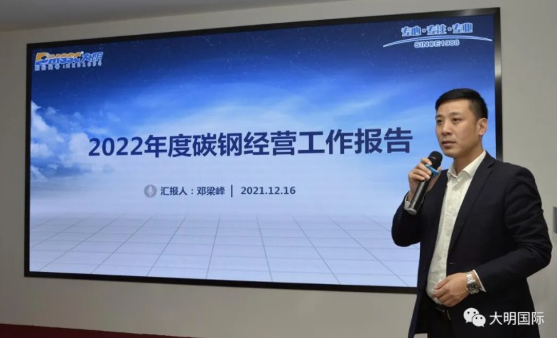 周克明主席首先分析了行业形势,为碳钢业务的发展指明了方向。他要求,要继续围绕“以客户为中心、以员工为中心”落实各项工作,2022年要财务前置、管理下沉,狠抓经营质量和工作作风。他指出,集团碳钢业务经过9年多的发展,前期不断的投入和积累已经打下了非常好的基础,平台的优势已经非常明显,目前“天时地利人和”俱备,已经到了收获期。他勉励全体同仁奋发有为,深入一线,2022年一定能取得更好的业绩。
