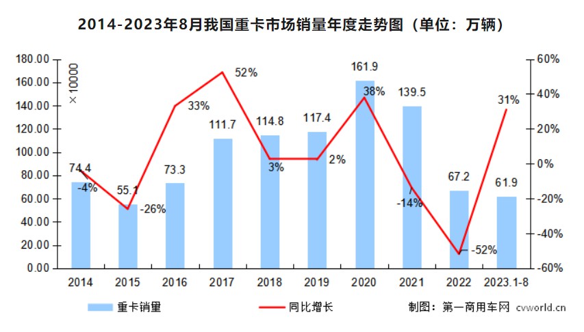 根据第一商用车网初步掌握的数据,2023年8月份,我国重卡市场大约销售6.9万辆左右(开票口径,包含出口和新能源),环比7月上升13%,比上年同期的4.62万辆增长49%,净增加约2.3万辆。这是今年市场继2月份以来的第七个月同比增长,今年1-8月,重卡市场累计销售61.9万辆,同比上涨31%,同比累计增速扩大了2个百分点。