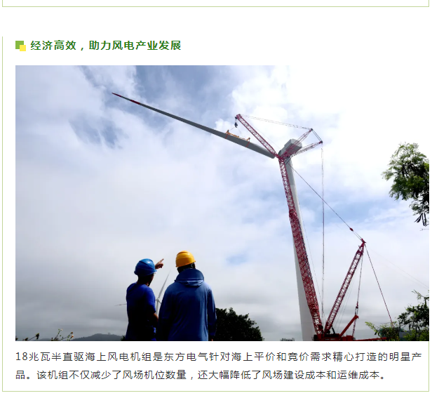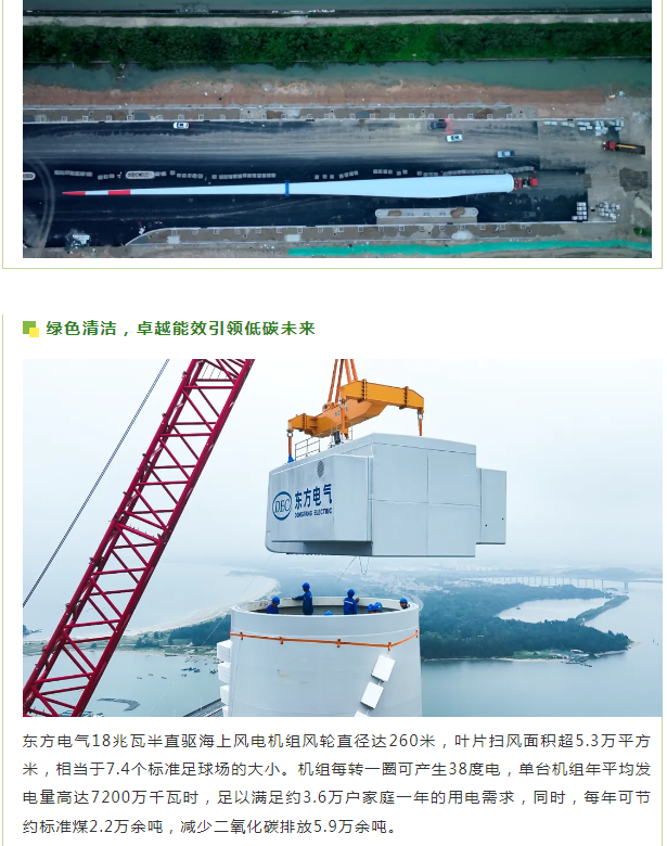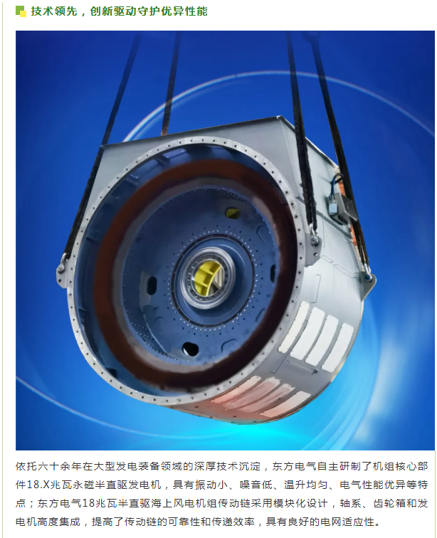 东方电气一直致力于推动海上风电技术的发展和创新。从2013年首台5兆瓦海上风电机组满发,到2019年亚洲首台10兆瓦海上风电机组问世,将中国风电带入“两位数”时代,再到如今的18兆瓦半直驱大功率海上风电机组成功吊装,东方电气不断刷新着中国风电纪录,不仅是在风电领域实现高水平科技自立自强的生动体现,也为中国风电产业的发展注入了强大的动力,是保障国家能源安全、推动绿色低碳转型的又一生动实践。