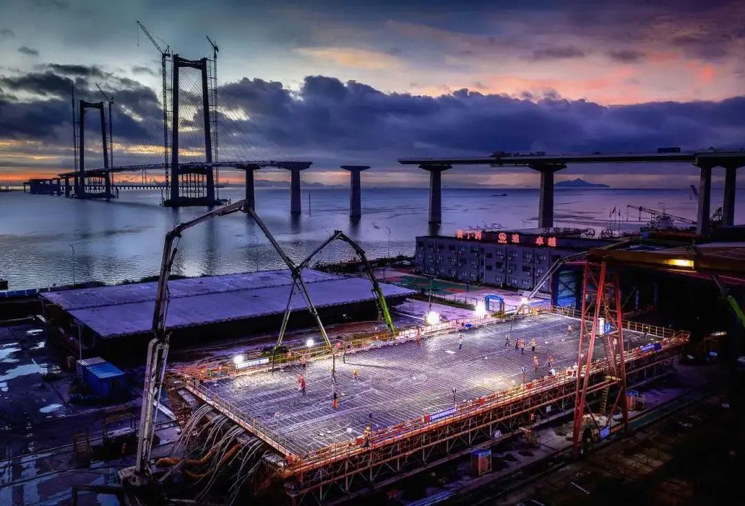 世界单体体量浇筑最大钢壳沉管自密实混凝土浇筑(单个管节混凝土浇筑方量达到2.9万立方米,累计91万立方米)