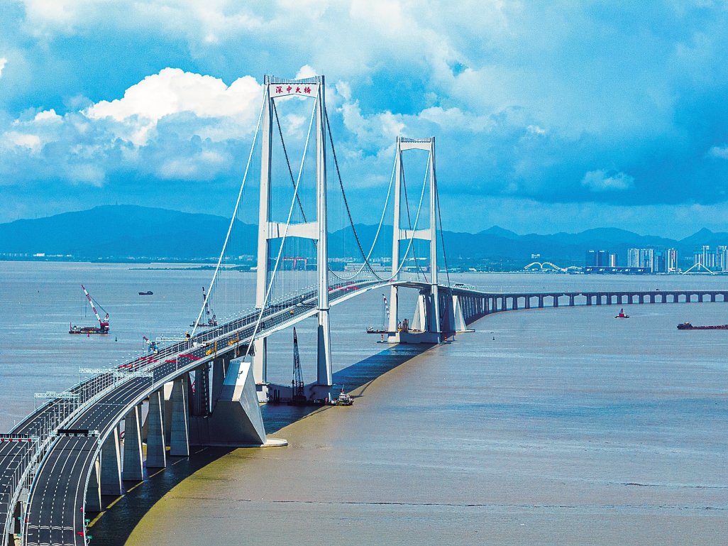 “为了保证往来船只顺利通航,深中大桥桥面高达91米,相当于30层楼高,是世界上最高通航净空的跨海桥梁。加之处在珠江口开阔水域,强台风频发,国外著名桥梁公司认为‘无法满足抗风安全要求’。”深中通道管理中心常务副主任范传斌说。“哪里能服输!”范传斌回忆道,在深中通道管理中心牵头组织下,多个单位联合攻关,历时3年多,研发了新型组合气动控制技术,攻克了台风频发区超大跨整体钢箱梁悬索桥灾变控制技术,一举打破了国外权威的论断。除此之外,正交异性钢桥面板疲劳及海中悬索桥主缆防腐等问题,也是世界性难题。悬索桥,指的是以通过索塔悬挂并锚固于两岸或桥两端的缆索作为上部结构主要承重构件的桥梁。“缆索是悬索桥受力的关键构件之一,也是悬索桥的‘生命线’。”范传斌介绍,深中大桥跨度大,且长期处于高温、高盐、高湿的海洋环境,金属腐蚀疲劳问题突出,全寿命周期不能更换,对缆索强度、耐腐蚀性要求极高。为此,深中大桥所使用的主缆钢丝十分特别:6毫米直径、2060兆帕的锌铝多元合金镀层钢丝,其耐盐雾腐蚀性能至少是现有热镀锌钢丝的1倍、锌铝镀层钢丝的2倍。“无论是强度还是耐腐蚀性能,都达到了世界领先水平。这也是我国自主研发的2060兆帕钢丝‘中国芯’在世界上首次大规模应用于悬索桥主缆建造。”范传斌介绍,深中大桥上下游共设两根主缆,单根主缆长约3000米、重约17000吨,由199束索股组成,每束索股又由127丝高强钢丝组成,单丝承载力可以吊起三辆小汽车。一桥飞架,跨越伶仃。五年时间里,建设团队克服了全海上作业、建设条件复杂、频发强台风等诸多不利条件,最终让深中大桥巍然矗立于海天之间。如今,自东向西,粤港澳大湾区世界级跨海集群工程深中通道若游龙潜海,又似长龙卧波,再次一举打破珠江两岸时空局限,为大湾区这片发展热土再添跨海通道。