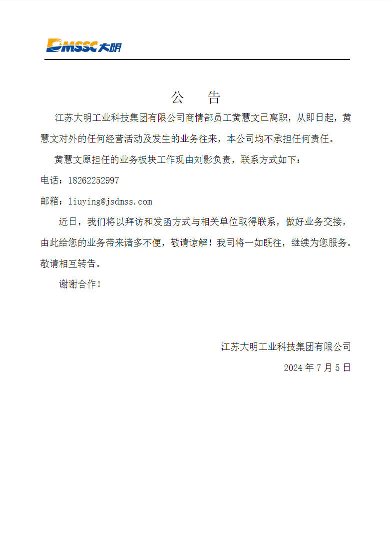 近日,我们将以拜访和发函方式与相关单位取得联系,做好业务交接,由此带来的诸多不便,敬请谅解,我司将一如既往,继续为您服务!